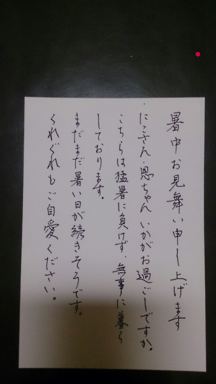 暑中お見舞いありがとうございます。 字が上手いんですけどー。嬉しかったです。